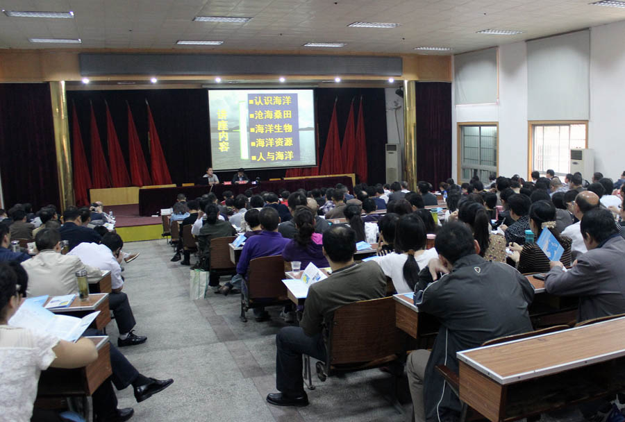 三.10月11日上午,中国地质大学逸夫博物馆馆长徐世球教授在荆州党校礼堂报告厅举行了一场题为《海洋的来龙去脉》的科普报告会。这也是本次科普活动周的一项重要活动。在近两个小时的时间内,徐世球教授从海洋的诞生到生命的摇篮,从沧海桑田到海洋生物的进化,从海底世界到人与海洋的共处,他用生动的图片、幽默风趣的演说赢得了现场观众一阵阵热烈的掌声。报告结束后,在场的学员们就徐世球教授的报告内容和平时所关心的问题进行踊跃提问,徐教授
