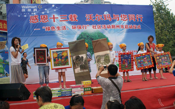 8月28日,荆州沃尔玛商场与荆州市环保局共同策划,市图书馆少儿分馆参与协办的“感恩十三载沃尔玛与您同行--绿色生活环保行”公益环保活动,在美佳华广场举行,众多市民踊跃参与。