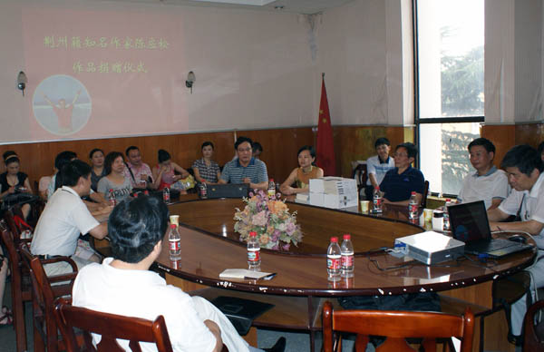 2009年7月23日上午,荆州籍的我国著名作家陈应松老师,将他创作的8部作品一式三套无偿捐赠给荆州市图书馆,作为图书馆馆藏永久保存利用。作品捐赠仪式在市图书馆举行,市委宣传部常务副部长陈志超、市文化局副局长宋兆菊、文化局调研员许泽胜等领导出席了赠书仪式。