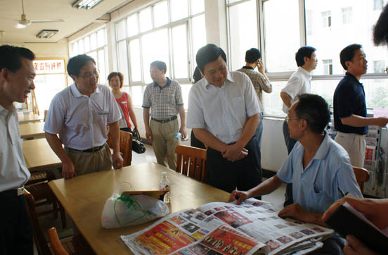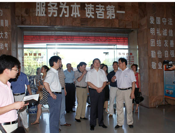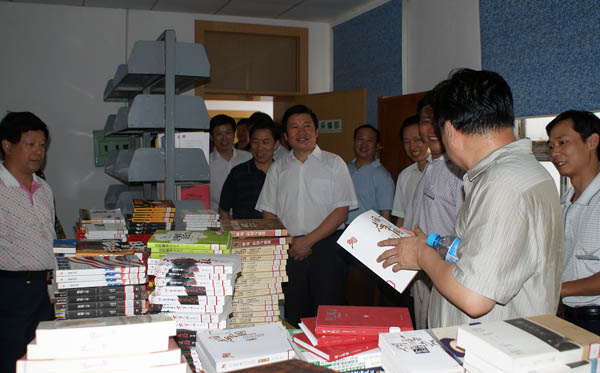 顶着酷暑高温,王祥喜一行来到市图书馆,欧阳军馆长详细介绍了市图书馆基本情况以及发展中遇到的困难。在阅览室王祥喜市长亲切地与在场读者交谈时说到:读者们有什么需求?欢迎你们提意见。随后,王市长在网络部了解了图书馆网站建设和共享工程服务情况,并叮嘱图书馆工作人员在当前要抓好文献资源数字化建设工作。在采编中心王祥喜还详细询问了市图书馆新书购置情况。当参观完图书馆古籍藏书库后,看到图书馆有几万册保存完好的线装书和善本,王市长十分高兴。