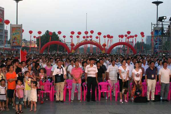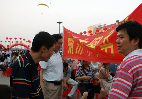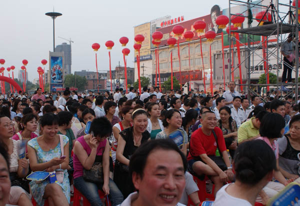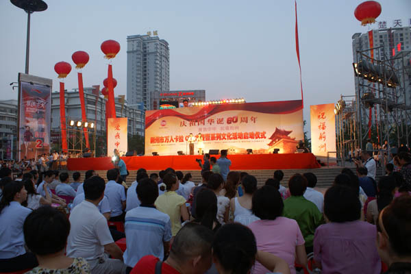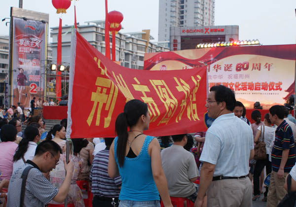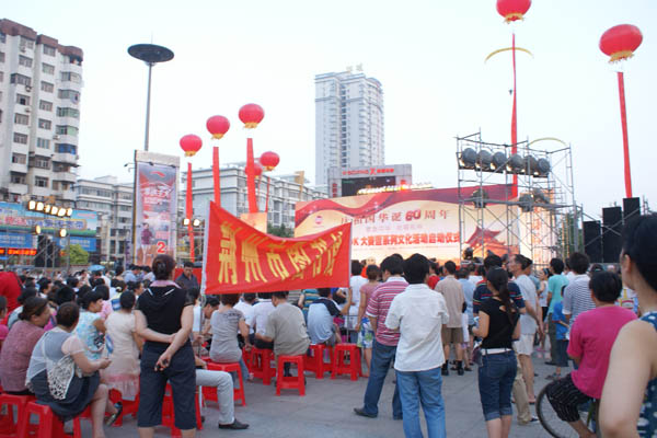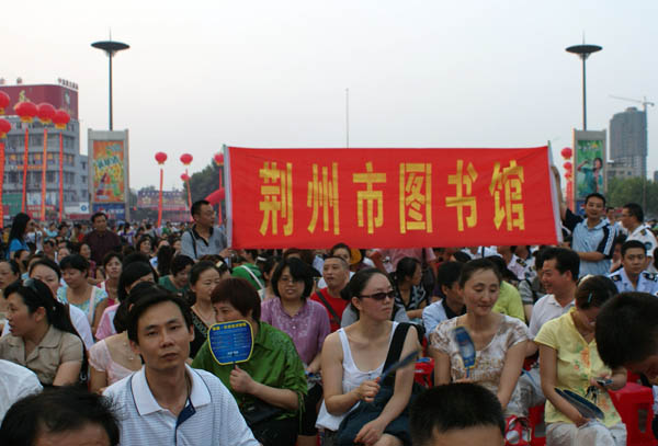 6月25日晚上7点,荆州市图书馆全体干部职工,到沙隆达广场,兴致勃勃参加了为庆祝建国60周年,由荆州市委宣传部、市文化局主办,以“弘扬先进文化,激发爱国热情,繁荣文化生活,共建和谐荆州”为主题荆州万人卡拉OK大赛暨系列文化活动启动仪式。